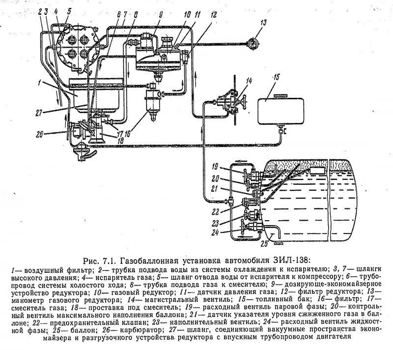 При переходе работы на газ пропан-бутановая смесь, находящаяся в баллоне в жидком состоянии, проходит по расходной магистрали к газовому редуктору-испарителю. Там происходит преобразование жидкой газовой смеси в газообразное состояние. Затем уже готовый к применению газ подается на форсунки.