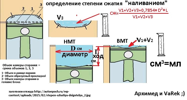 Вычислить степень сжатия ДВС можно, если выполнить расчет по формуле ξ = (Vр + Vс)/ Vс; где Vр – рабочий объем цилиндра, Vс – объем камеры сгорания. Из формулы видно, что степень сжатия можно сделать больше, уменьшив, объем камеры сгорания. Или увеличив, рабочий объем цилиндра, не изменяя камеры сгорания.