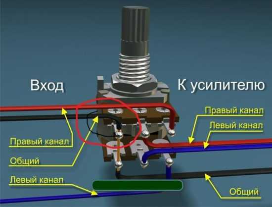 К регулятору припаивается 3 провода — левый канал, правый и общий