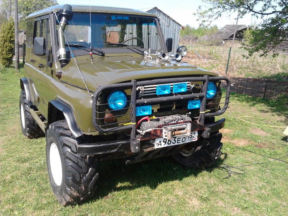 На этом уазике пройдено много сотен километров по бездорожью, участвовал в соревнованих, но не профессионально. Сделан лифт кузова и подвески, установлены самодельные бампера и багажник, лебедка ComeUp, 35-е колеса maxxiss mudzilla. На УАЗике изначально стояли военные мосты. С ними 35 колеса крутить значительно легче, чем на других мостах УАЗ.
