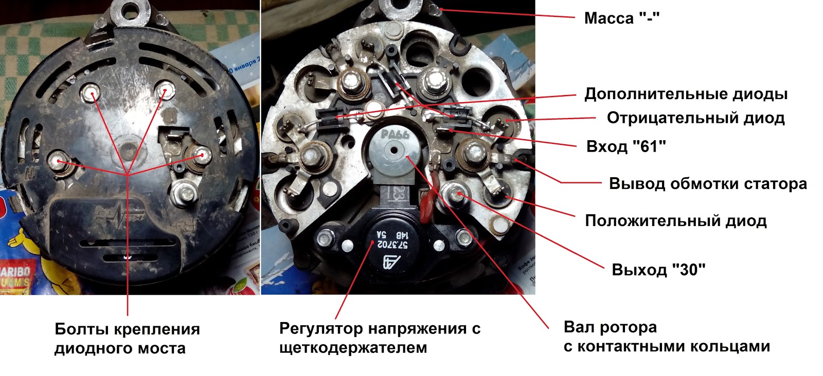 Дополнительные диоды «прозваниваются» так: «плюс» через лампу подключается к выводу генератора «61», а «-» идет на болт крепления диодного моста. Свет лампы укажет на наличие короткого замыкания в одном из дополнительных диодов. В заключение отметим, что определить, какой именно диод выдает замыкание, возможно лишь после снятия моста и поочередной проверки всех его элементов.