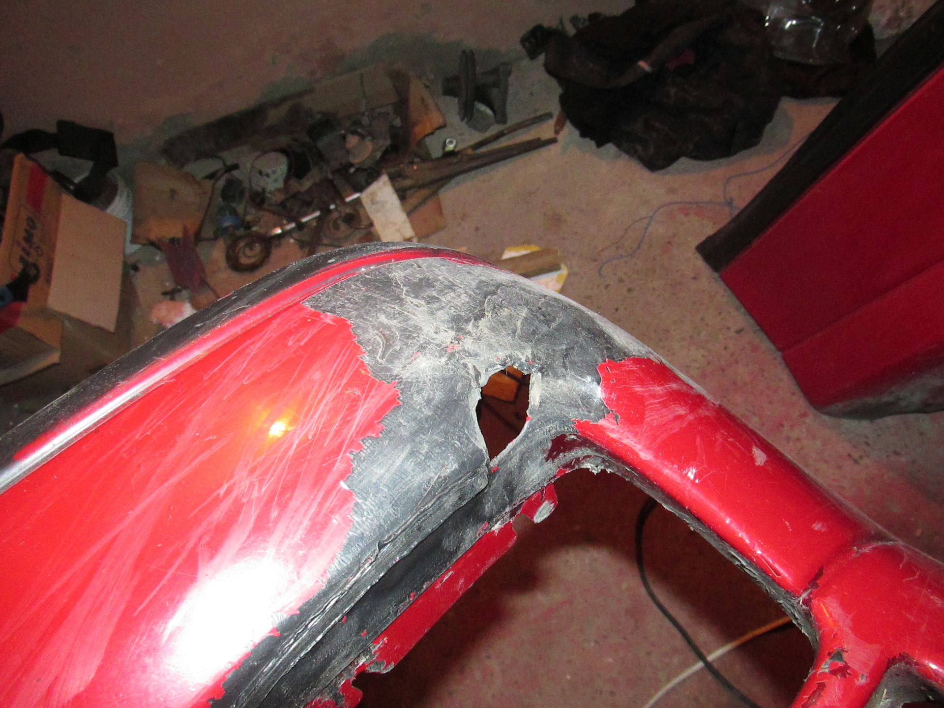 Первым делом надо зачистить края от поврежденного слоя краски и резких углов. Это нужно, чтобы после нанесения шпатлевки не было неровностей поверхности. В принципе сделать это можно, даже когда он еще установлен на автомобиле. Но для следующей процедуры в любом случае понадобится снимать его.