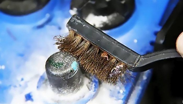 Если же простая щетка не помогает можно взять специальную металлическую щетку и также обмокнуть ее в раствор для чистки. Если же следы окисла не удалось очистить полностью — воспользуйтесь наждачной бумагой.