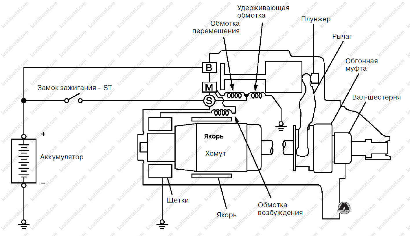 Принцип работы стартера заключается в следующем: При замыкании контактов замка зажигания по