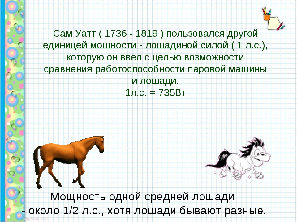 В те времена большая часть задач выполнялась с помощью лошадей.Используется для повышенной заинтересованности людей в разработке Ватт и придумал новую единицу измерения, которая используется до сих пор — лошадиные силы. Фермеры и бизнесмены охотнее воспримут положения. Для определения количества лошадей, работу которых может заменить устройство, инженер провел серию экспериментов на угольных шахтах.
