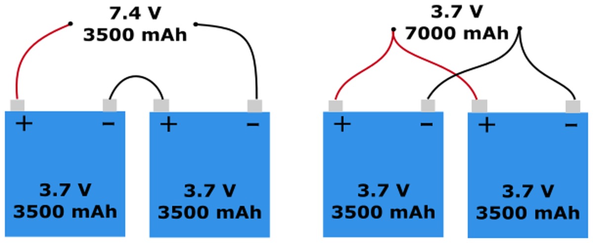 Электрические батареи могут достигать необходимого рабочего напряжения путем последовательного подсоединения нескольких элементов — каждый элемент добавляет свой показатель напряжения к общему напряжению всей системы. Параллельное же соединение обеспечит более высокий показатель емкости и силы тока — суммарная емкость такой системы будет равна сумме емкостей всех подключенных элементов, сила тока также будет равняться сумме значений всех элементов.