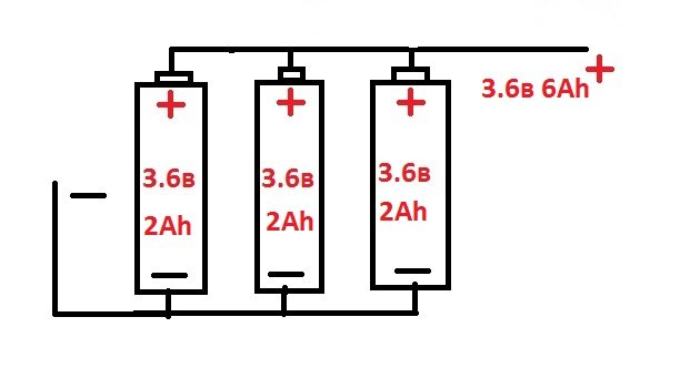 При таком соединении цепочки последовательно соединенных аккумуляторов соединяются параллельно.