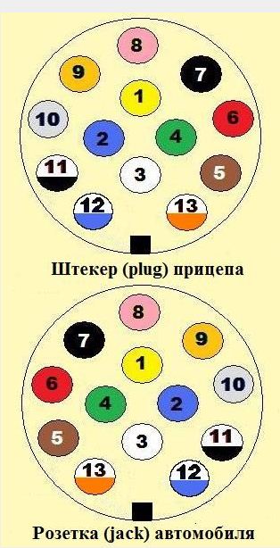 Номера контактов и цвета проводов 13 пиновой розетки