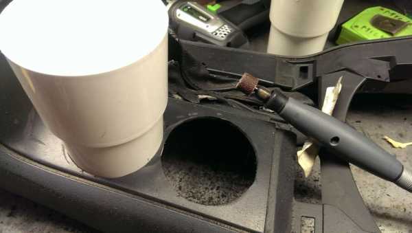 Шаг 1. Первым делом нужно видоизменить консоль коробки передач. Для этого ее лучше снять и на рабочей поверхности при помощи кольцевого сверла и дрели вырезать два разъема для подстаканников.